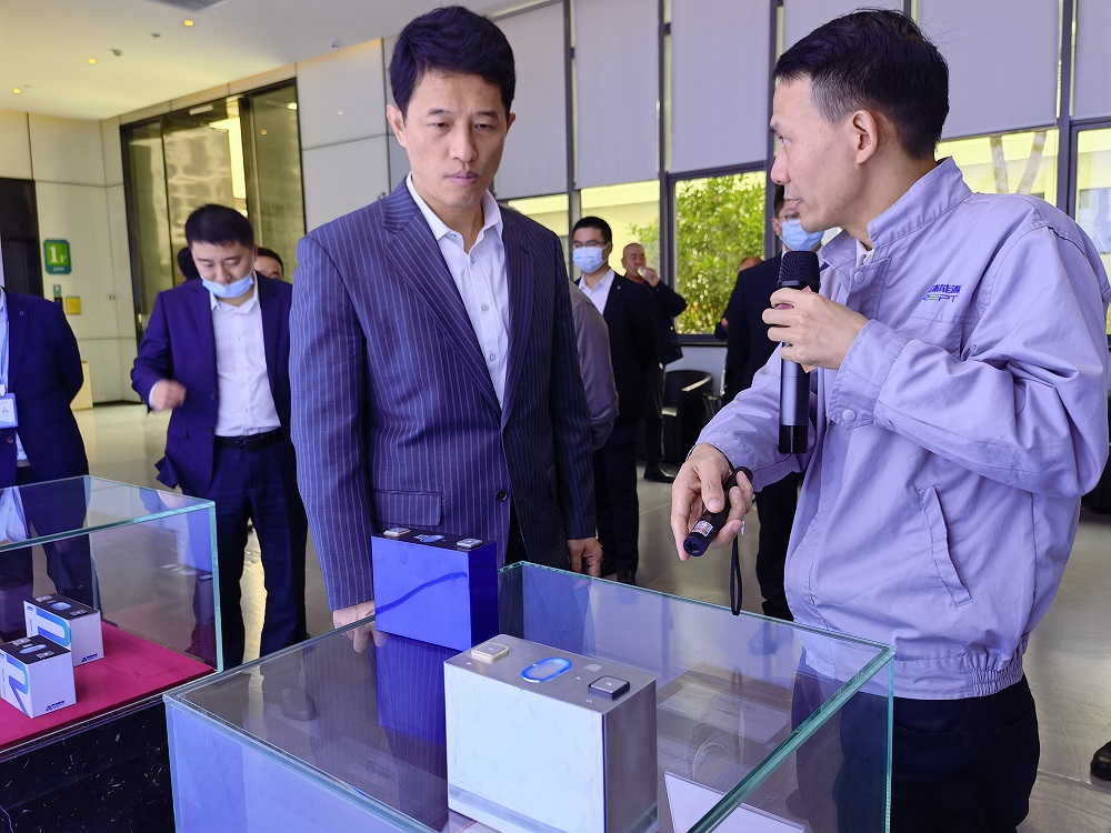 王强一行参观了公司展厅、智能制造车间,认真听取了生产工艺、项目运营、产品应用、阶段性成果等方面情况的汇报。曹辉介绍到:瑞浦能源为突破行业技术壁垒,自主研发了多极耳模切技术、自均衡技术,始终专注于为新能源汽车动力及智慧电力储能提供优质解决方案,以高质量产品推动高质量发展。