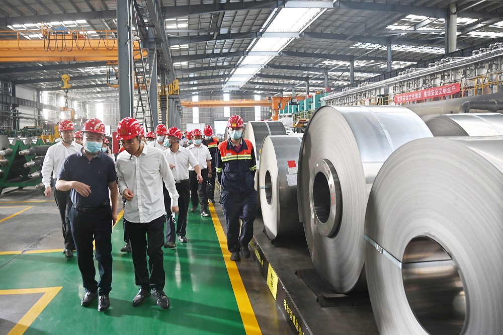 调研组一行走进福安青拓冷轧科技有限公司,实地察看青拓不锈钢冷轧及深加工配套项目。姜海洪为调研组详细介绍冷轧深加工产业链工艺流程以及公司即将生产出的具有高强度、高品质、高附加值的不锈钢新材料产品,他特别强调,青拓集团的轧制水平将于9月中旬达到0.03mm,达到手撕钢轧制的超薄高端目标。